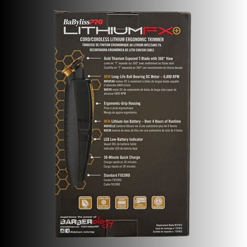 Efficient, ergonomic precision! The most lightweight and affordable of the BaBylissPRO professional trimmers, LithiumFX Hair Trimmer delivers incredible precision performance, ergonomics and long-life battery. Long-life ball bearing DC motor runs at a powerful 6800 rpm. Gold titanium exposed T-blade with 360˚ view – loved for precision and closeness. Zero gap adjustable. High-capacity lithium-ion battery provides over four hours of cordless runtime. Sleek, comfortable, and lightweight. FXCord universal charging port makes it easy to charge between tools.