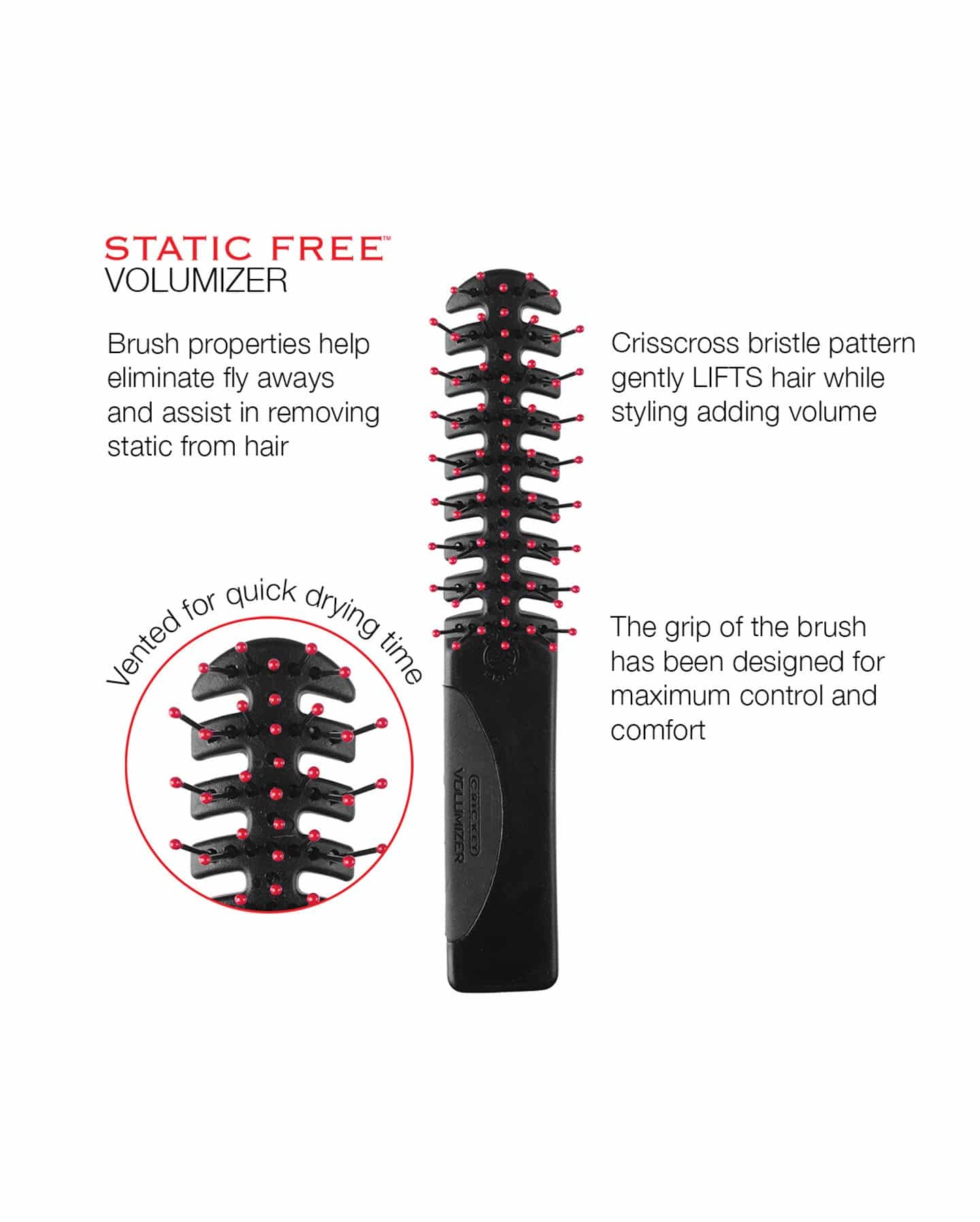 Need a lift? Cricket's Static Free Volumizer's unique crisscross bristle pattern lifts and adds envious volume. Equipped with an ultra-lightweight vented pattern to accelerate hair drying time and reduces heat damage. This product eliminates pesky, fly-away hairs and has reinforced "stay-put" ball tips and non-slip grips for maximum styling control and comfort.