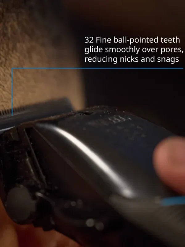 - 32 fine ball-point teeth glide smoothly over pores, reducing nicks and snags.