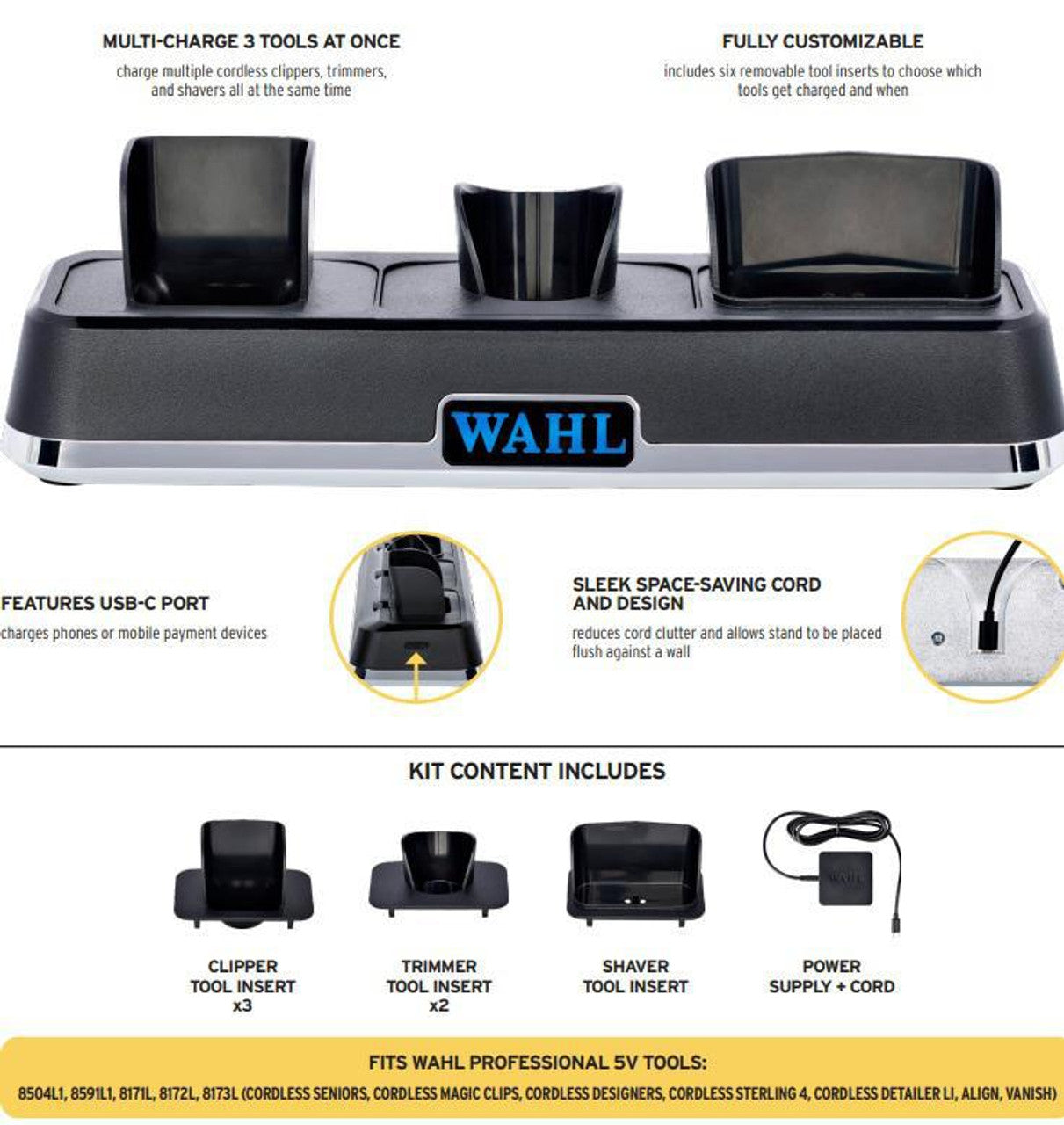 Safely charging three cord/cordless 5V Wahl Professional tools at the same speed of charging a single clipper battery, the Wahl Professional Power Station takes charging to a whole new level. With six interchangeable tool inserts, barbers can display and charge any combination of Wahl cordless clippers, trimmers, and shavers. The USB-C port on the clipper charge station allows Pros to charge mobile and payment devices. With a space-saving cord design, the multi charger Power Station can be flush against a wall for maximum workspace and minimal clutter