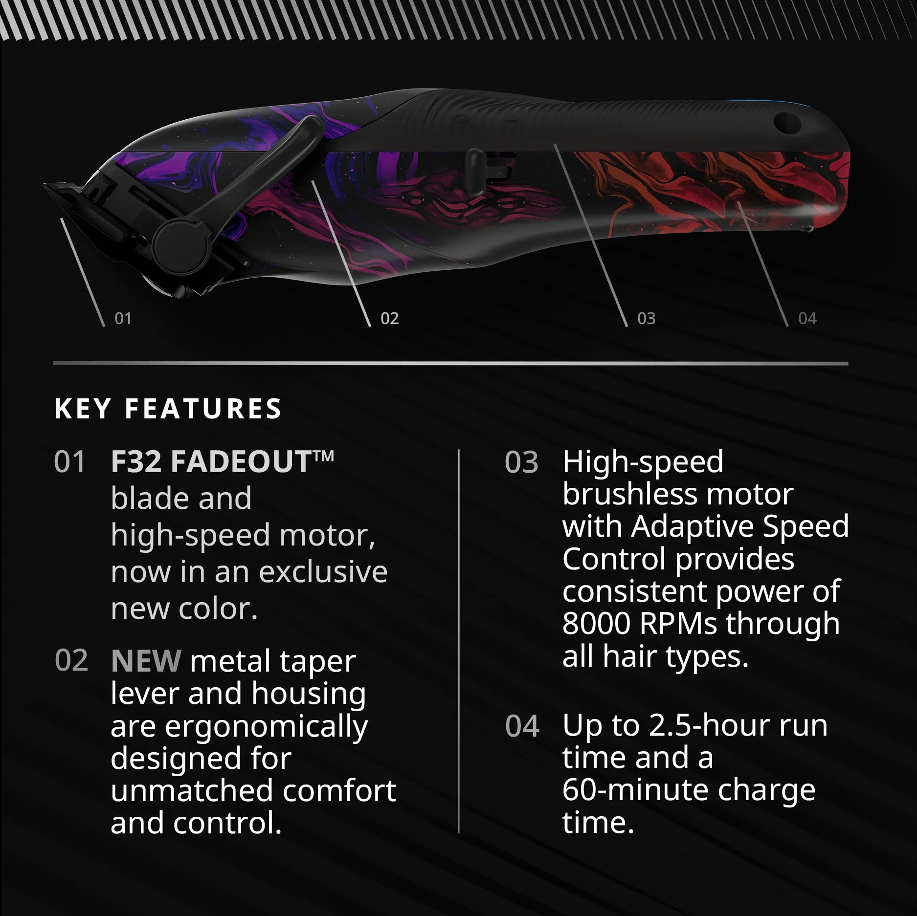 One-of-a-kind clipper with custom hydro dipped body, rubberized grip, and advanced F32 Fadeout™ blade for seamless balding and fades. Limited quantities available.